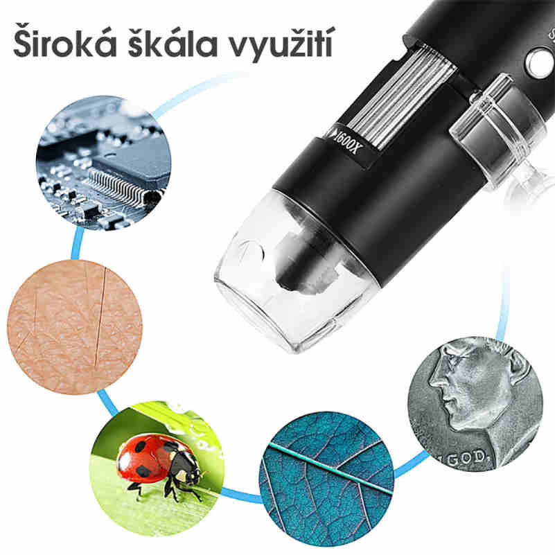 Zajímá Vás jak vypadá zblízka Váš vlas, mravenec nebo květina? Tento technicky vyspělý barevný mikroskop je určen pro každého zvídavého amatéra, ale i pro praktické použití v dílně, filatelii, sběratelství apod.Mikroskop připojíte k telefonu nebo PC USB kabelem a na obrazovce vidíte sledovaný předmět. Jednoduše stiskem tlačítka na mikroskopu můžete ukládat fotografie nebo pořídit videozáznam.